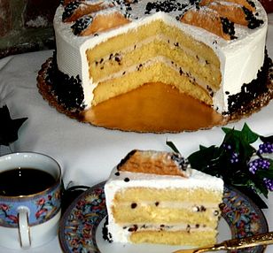 Three layers of vanilla cake filled with a family recipe cannili cream. Iced in vanilla whipped cream and surrounded by mini chocolate chips. Finished with mini cannolis.