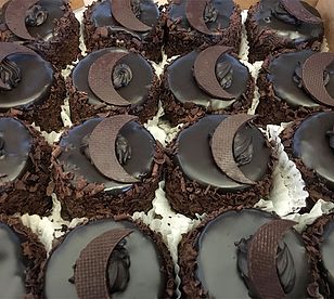 Fudge cake soaked with coffee liqueur and filled with chocolate mousse. Dipped in rich French ganache and finished with chocolate curls and a crescent moon.